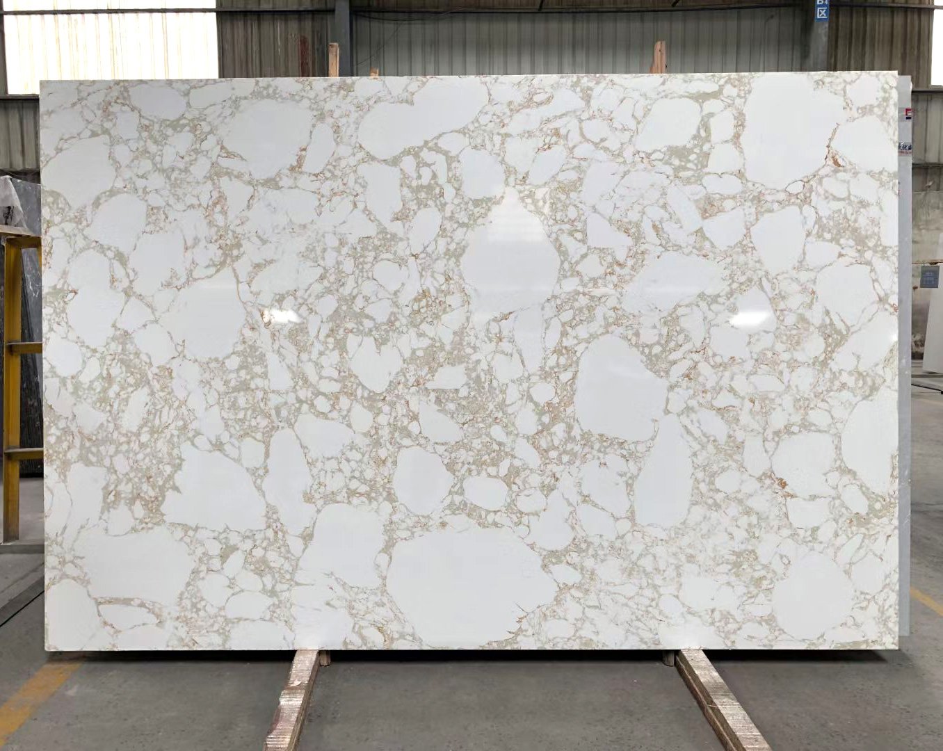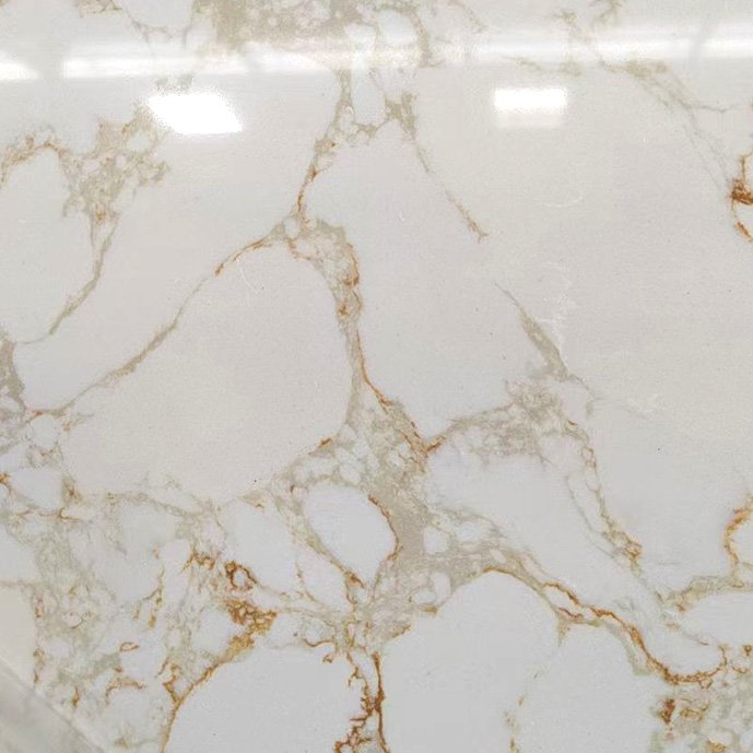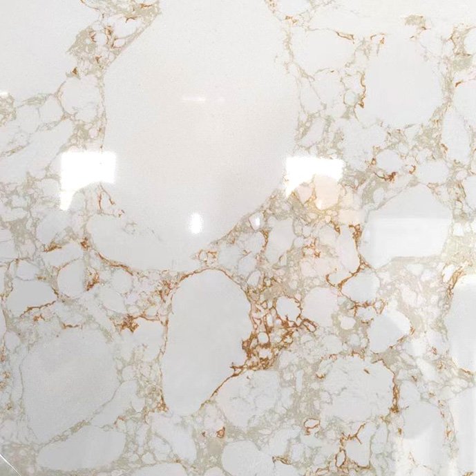 Golden Veil is an elegant engineered marble featuring a soft white base with delicate, natural-looking gold veins. The intricate golden veining flows effortlessly across the surface, creating a luxurious and timeless design that mimics the beauty of nature. Perfect for high-end engineered marble countertops, feature walls, and flooring, Golden Veil offers both exceptional durability and sophisticated elegance. Its natural, non-artificial appearance makes it ideal for upscale residential and commercial spaces, bringing an air of refined luxury to any interior.